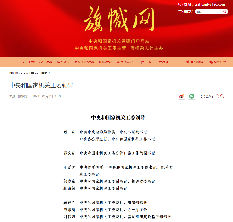 据中央和国家机关党建门户网站旗帜网信息显示,蔡奇已兼任中央和国家机关工委书记,郭文奇已任中央和国家机关工委分管日常工作的副书记。