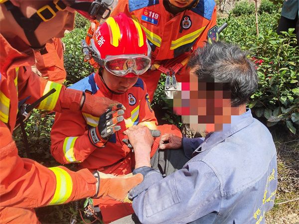 由于被困人员在茶叶地,消防车无法直达现场,消防员背着救援工具“跋山涉水”,在村民的指引下抵达被困人员所在位置,发现一村民的左手被野猪夹死死“咬”住无法挣脱,经过8分钟的紧张救援,被困人员的手终于从“枷锁”中脱离。