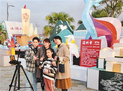 2023南投灯会近日在台湾南投举行。应南投县政府邀请,浙江省温州市选送彩灯作品“千年商港·幸福温州”参与本次灯会。该灯组设置的宋代福船与亚运场馆“温州龙舟运动中心”的造型相呼应,展示了温州传统与现代交织的风貌。同时,刻纸灯笼、木字模、廊桥等灯组形象向台湾地区民众展示了当地细纹刻字、活字印刷、泰顺廊桥等非物质文化遗产。图为台湾民众在温州花灯前拍照留念。